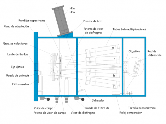 Como se puede ver se puede ver en el esquema, a la entrada del instrumento (izquierda en la figura) se encuentra una lente de Barlow, necesaria para adaptar la focal f:15 del fotómetro a la f:8 del telescopio. A continuación, a lo largo del camino óptico hay una rueda de entrada con tres posiciones: "obturador abierto", "obturador cerrado'' y "filtro neutro''. Tras la rueda se hallan los prismas de los visores de campo y diafragma, que envían eventualmente la luz a los respectivos visores situados en el frontal del fotómetro. Entre ambos prismas, se encuentra la rueda de diafragmas (no dibujada en la figura por estar debajo de las rendijas espectrales) con seis aperturas diferentes. En el visor de diafragma hay acoplada una pequeña CCD que permite realizar autocentrados automáticos de los objetos desde el programa de control general.